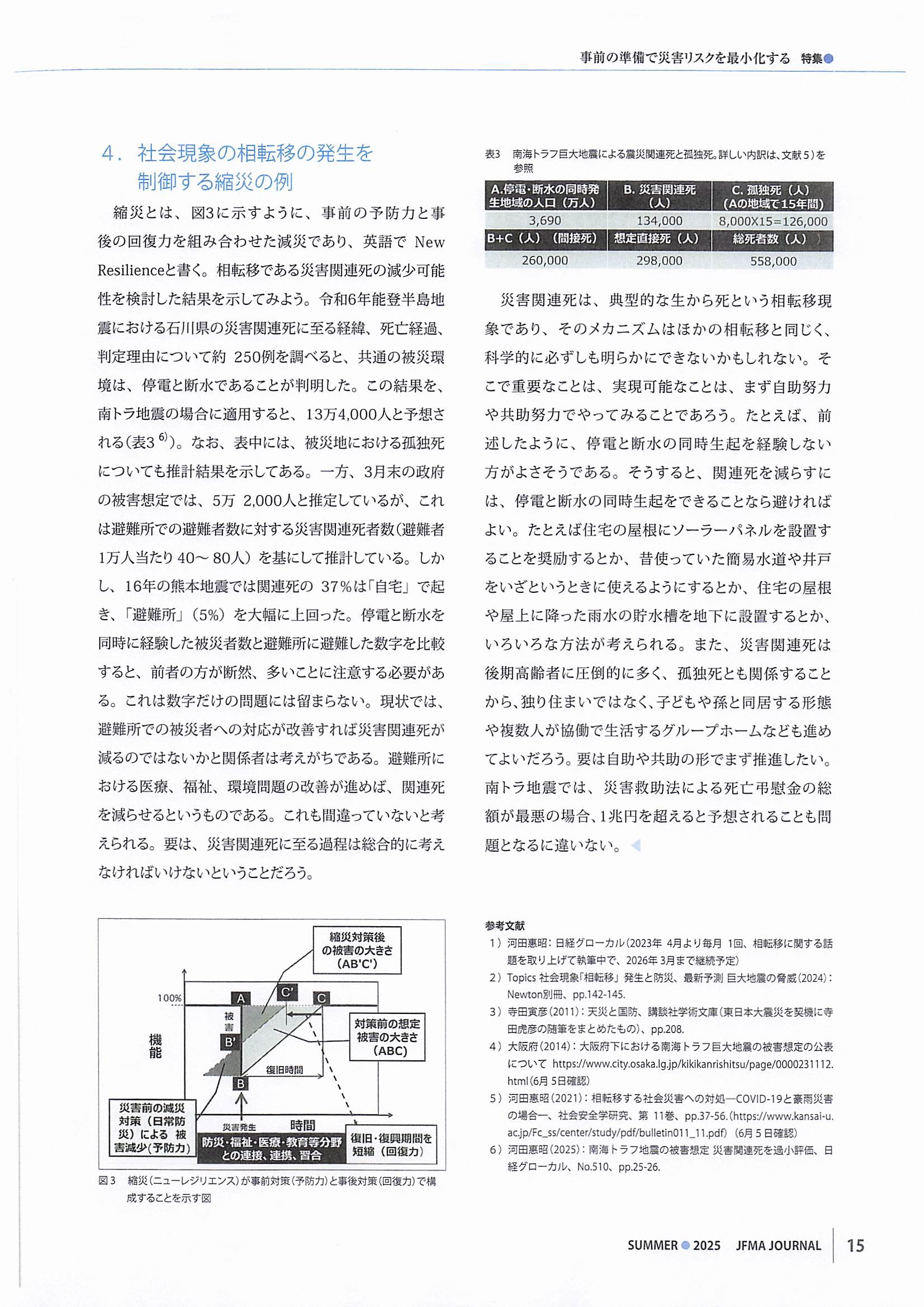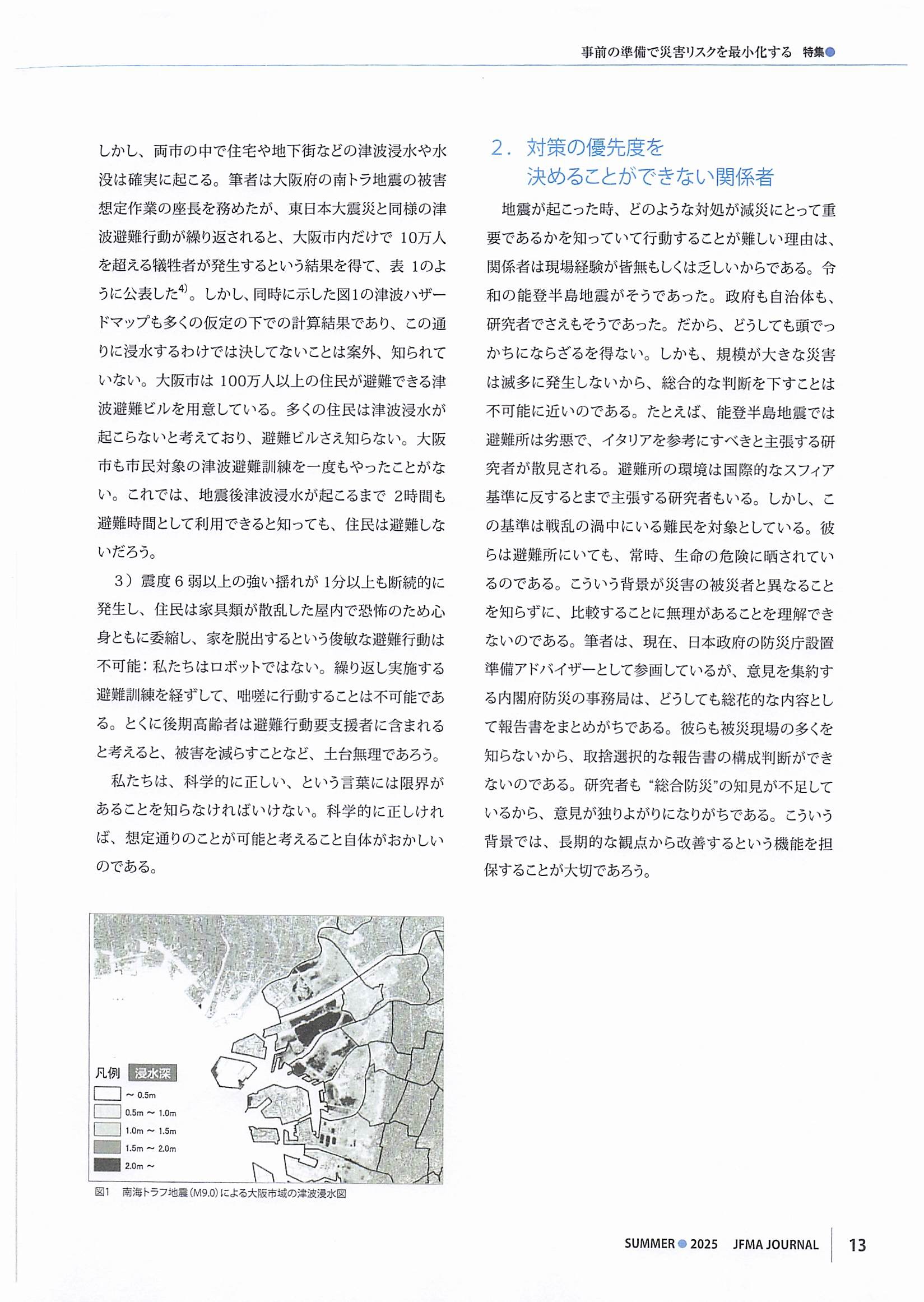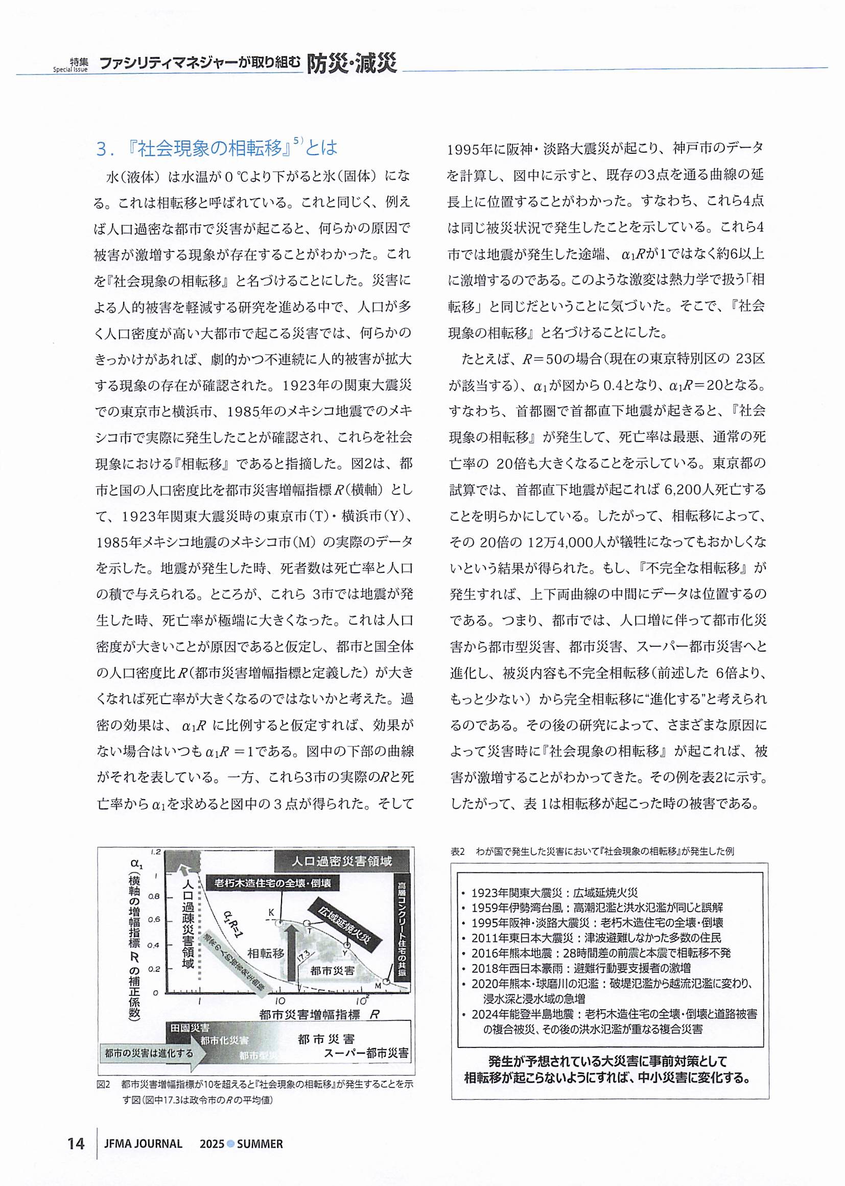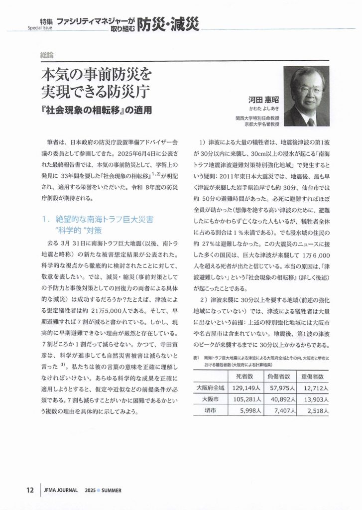 ファシリティマネジメント(FM)の普及・啓発に取り組んでいる公益社団法人・日本ファシリティマネジメント協会様の機関誌『ジャフマジャーナル(JFMA JOURNAL)』2025 SUMMER号で、当フォーラム共同代表の河田惠昭関西大学特別任命教授・社会安全研究センター長の「本気の事前防災を実現できる防災庁『社会現象の相転移の適用』」と題した論文が、「特集・ファシリティマネージャーが取り組む防災・減災」の総論として掲載されました。
