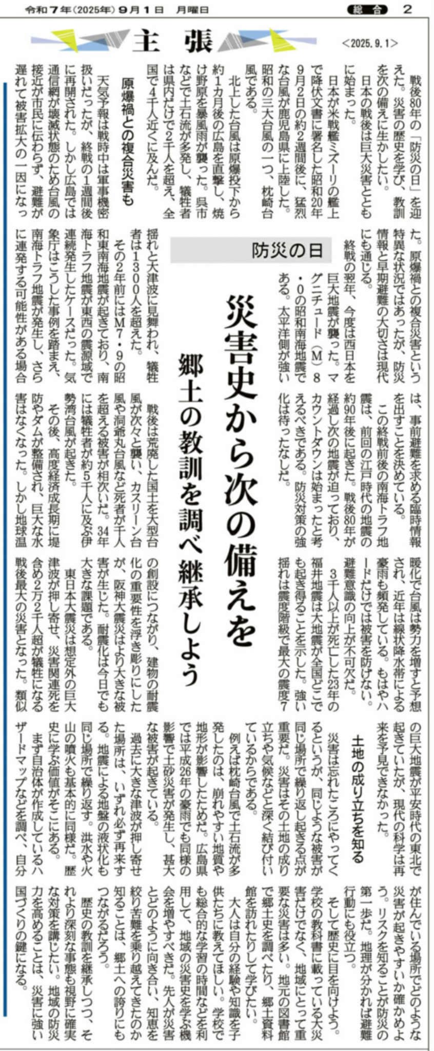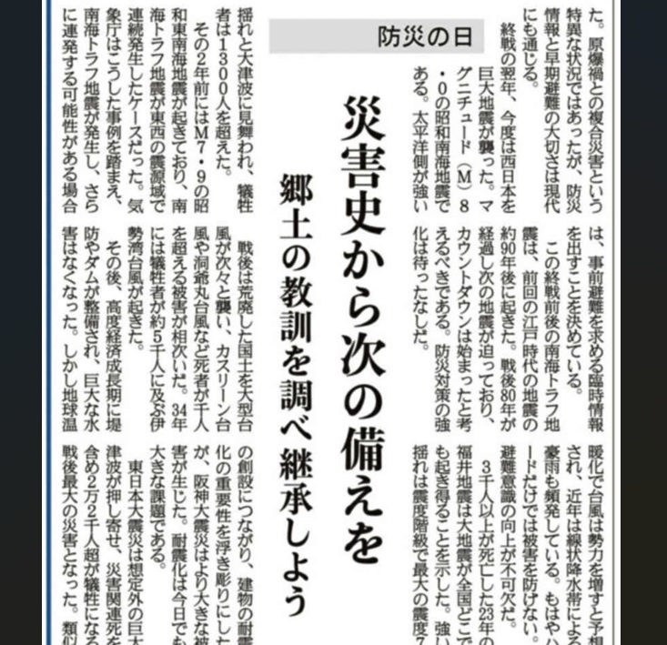 令和7年9月1日(防災の日)に産経新聞に掲載された「災害史から次の備えを 郷土の教訓を調べ継承しよう」と題する社説が良記事でしたので、ご紹介いたします。