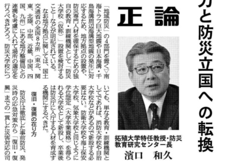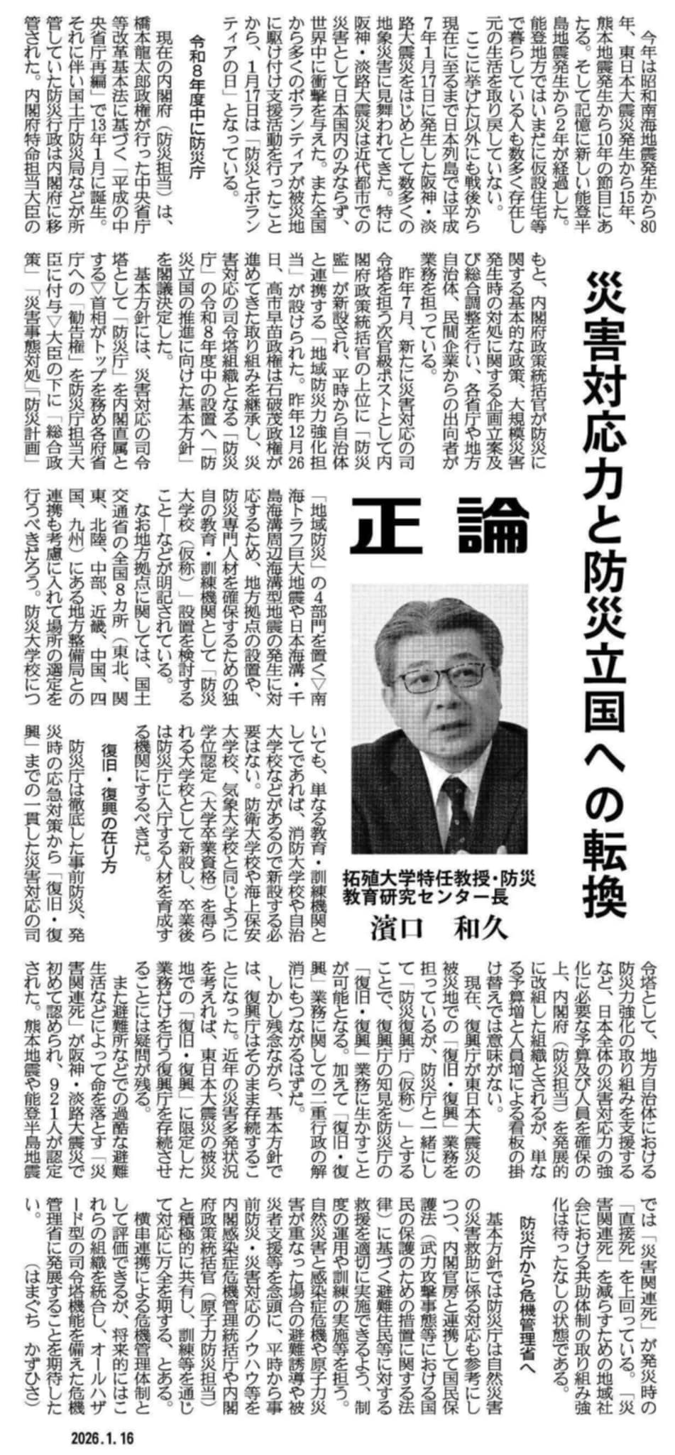 令和8年1月16日の産経新聞正論コラムに、当フォーラム事務局長である濱口和久・拓殖大学特任教授・防災教育研究センター長の『災害対応力と防災立国への転換』と題する論考が掲載されましたのでお知らせいたします。