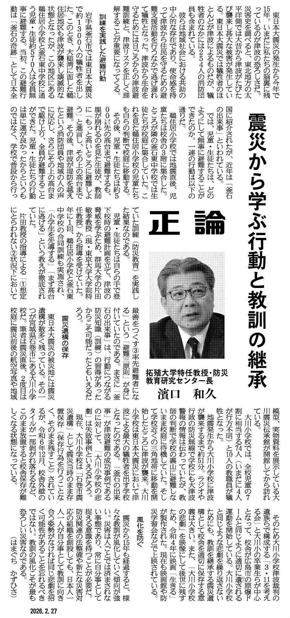 令和8年2月27日の産経新聞正論コラムに、当フォーラム事務局長である濱口和久・拓殖大学特任教授・防災教育研究センター長の『震災から学ぶ行動と教訓の継承』と題する論考が掲載されましたのでお知らせいたします。